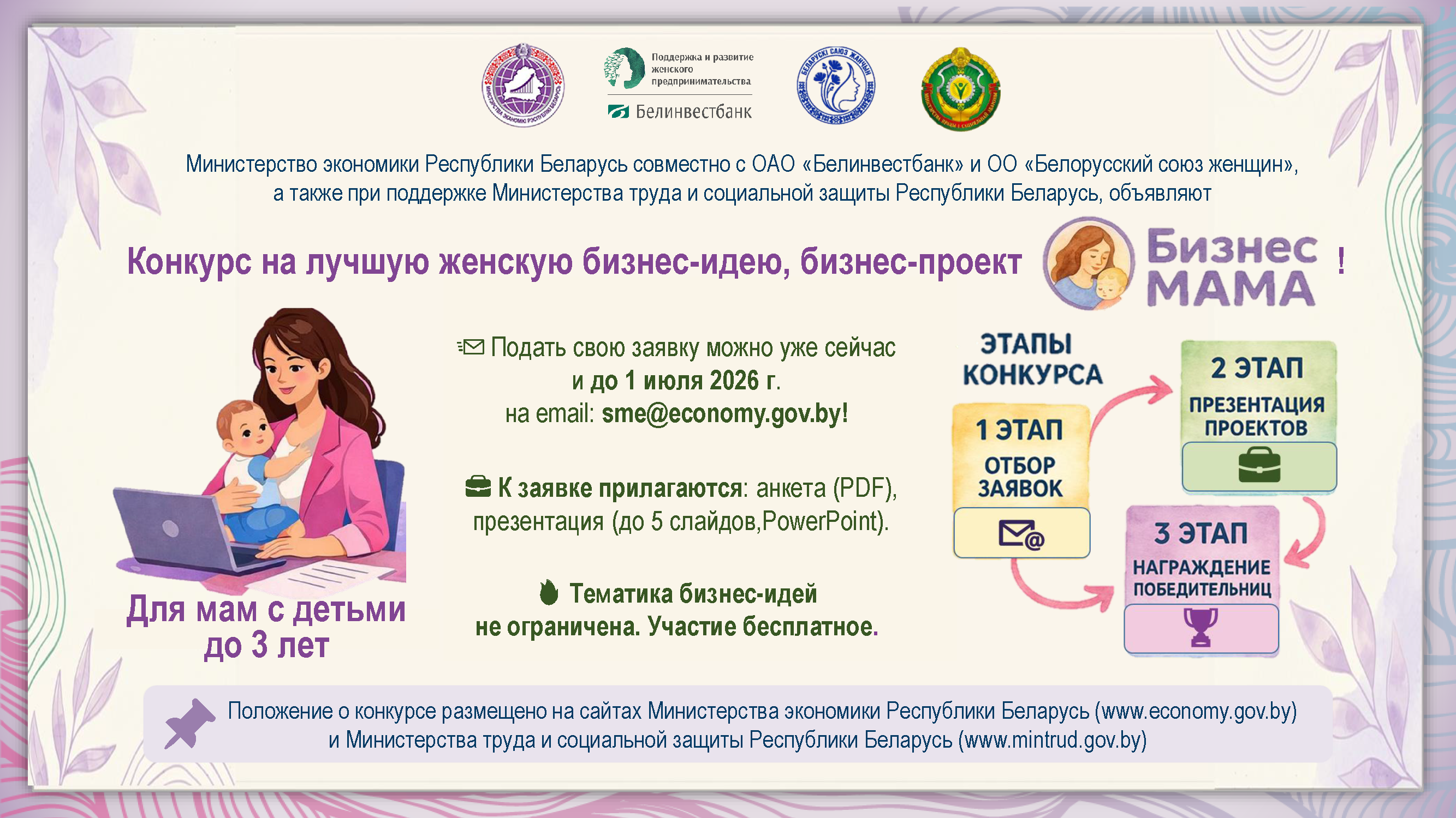 Министерство экономики Республики Беларусь совместно с Белорусским союзом женщин и ОАО «Белинвестбанк» при поддержке Министерства труда и социальной защиты объявляет о старте конкурса на лучшую бизнес-идею, бизнес-проект «БизнесМАМА».