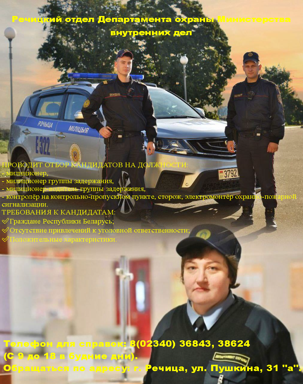 ![]() Речицкий отдел Департамента охраны Министерства внутренних дел проводит отбор кандидатов на должности: милиционер, милиционер группы задержания, милиционер-водитель группы задержания, контролёр на контрольно-пропускном пункте, сторож, электромонтёр охранно-пожарной сигнализации. ТРЕБОВАНИЯ К КАНДИДАТАМ: ✅Граждане Республики Беларусь; Телефон для справок: 8(02340) 36843, 38624 (С 9 до 18 в будние дни). Обращаться по адресу: г. Речица, ул. Пушкина, 31 "а". Вернуться назад |