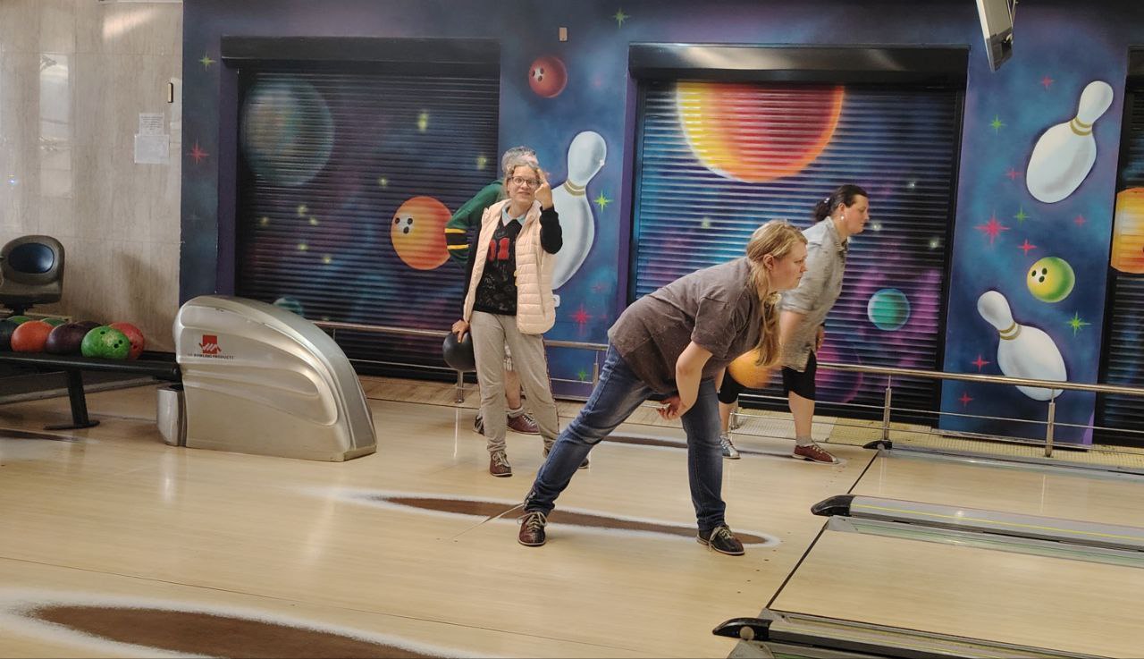 Каждый выбрал свой любимый шар и с азартом бросал его по дорожке. После боулинга все переместились в бильярдную. Смех и поддержка друг друга создавали атмосферу настоящего праздника!