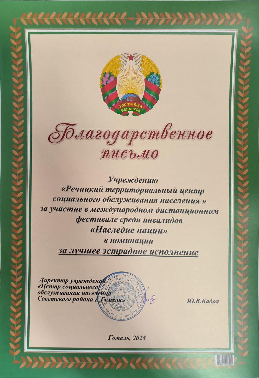 Поздравляем Екатерину Свист, воспитанницу отделения социальной реабилитации, абилитации инвалидов, за участие в международном дистанционном фестивале среди инвалидов "Наследие нации" в номинации "ЗА ЛУЧШЕЕ ЭСТРАДНОЕ ИСПОЛНЕНИЕ".